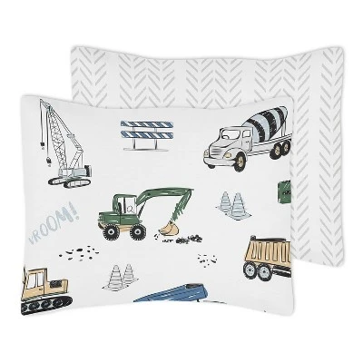 The 5pc Green and Blue Construction toddler bedding collection by Sweet Jojo Designs. This delightful boy bedding set uses a sensational collection of exclusive brushed microfiber fabrics. It combines a fun coloring book inspired truck print, a coordinating tire print, and solid fabrics. The colorful palette of green, yellow, light blue, gray and black will create the perfect transportation themed bedroom. This Sweet Jojo Designs set will fit all standard toddler beds and is machine washable for easy care and repeated use.