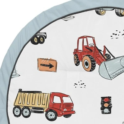 Construction Truck Collection Play Mats by Sweet Jojo Designs make tummy time and child development stylish and fun. Made with soft fabrics and fluffy fill, this multi-functional mat is small enough to take on the go. These adorable playmats will transform any room into the perfect play space. Great for vacations, playdates, beach outings, and everyday use at home. Always be aware of baby’s surroundings and keep an eye on baby while in use. Not intended for sleep. Sweet Jojo Designs creates various coordinating room accessories and decor for all of their children’s bedding and nursery bedding set collections (These items not included). Playmat is designed using a multicolor construction truck print and finished with dark grey piping and a light blue border – Brushed Microfiber and Denim