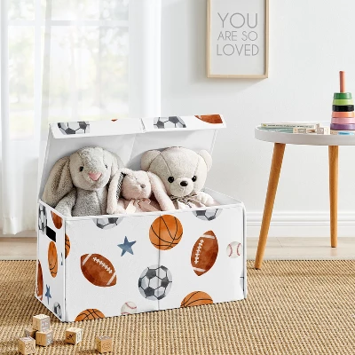 Watercolor Sports Theme Sweet Jojo Designs storage box is the perfect combination of decor and storage to bring a stylish update to your baby nursery, bed room, home gym, home office, home theater, kids bed room, kitchen, livingroom, classroom, closet, college dorm, den, apartment, attic, basement, bathroom, family room, foyer, gaming room, guest room, mud room, pantry, play room or garage. This collapsible fabric toy storage features exclusive patterns and prints to create a convenient and chic decorative toy chest to use for any occasion. Made from a flexible and foldable material, simply fold flat and store for easy space saving storage when not in use. With the variety of designs available, any room for baby, children, teens, college students, or adults will be easily upgraded with these simple storage solutions. Declutter your home with an organizer box to help meet your organization needs for all common household items such as small plush toys, stuffed animals, baby clothing, shoes, wash cloths, books, and more. Pair your toy bin storage organizer with your favorite Sweet Jojo Designs collections and coordinate with our crib bedding sets, twin or queen bed sets, window valances, and room decor accessories to give you a complete look for any room in your home. •Makes the perfect gift to coordinate with Sweet Jojo Designs nursery bedding, cribsheets, changing pad covers, nursing pillow covers, duvets, sheet sets, window treatments, wall decor, and home decor accessories. It can also double as a functional decorative alternative to gift bags or wrapping paper by holding your wedding gifts, housewarming gift, birthday presents, baby shower gifts and gender reveal presents within the decorative box itself. Kid friendly storage solutions are perfect for holding your children’s items, newborn essentials, or general home goods such as blankets, pillows, Montessori educational supplies, toys, stuffed animals, sheets, books, linens, towels, clothing, dog toys and more. Made with reinforced cut out handles for convenience with transporting items as well as a reinforced flip lid to be able to cover clutter, making this toy bin a versatile must have for any room. This brushed microfiber fabric toy storage organizer features an exclusive design of a watercolor vintage sports theme soccer balls football baseball basketball blue stars sport themed print.