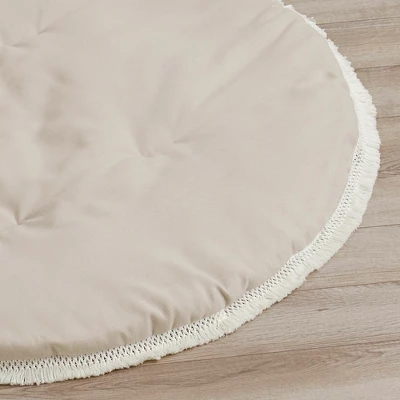 Boho Fringe Linen Collection Play Mats by Sweet Jojo Designs make tummy time and child development stylish and fun. Made with soft fabrics and fluffy fill, this multi-functional mat is small enough to take on the go. These adorable playmats will transform any room into the perfect play space. Great for vacations, playdates, beach outings, and everyday use at home. Always be aware of baby’s surroundings and keep an eye on baby while in use. Not intended for sleep. Sweet Jojo Designs creates various coordinating room accessories and decor for all of their children’s bedding and nursery bedding set collections (These items not included). Playmat is designed using a solid taupe fabric and is finished with a knotted tassel macrame trim – Linen Blend and Cotton