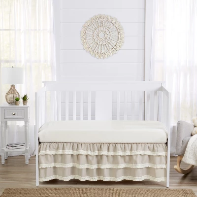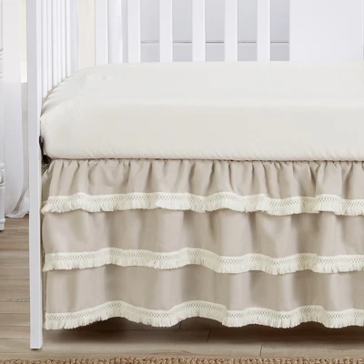 Boho Fringe Linen Collection 3 tier crib skirt or dust ruffle adds a finishing touch to your nursery. Decorate with this stylish mix and match piece with a sheet yo ualredy own or coordinate with an existing Sweet Jojo Designs ensemble to get a complete bedding set look. Sweet Jojo Designs creates various coordinating room accessories and decor for all of their children’s bedding and nursery bedding set collections (These items not included). Linen Blend and Cotton – Solid Taupe Finished with a Knotted Tassel Macrame Fringe