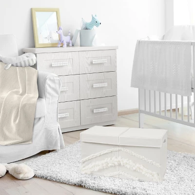 Boho Fringe Collection Sweet Jojo Designs fabric toy bins are perfect for storing and organizing unruly clutter in any room or nursery. Each toy box features an attached flip lid to keep clutter out of sight, including dirty clothes to replace your clothing hampers and baskets. This kid friendly storage solution is collapsible to save space when not in use. Built-in reinforced handles for easy transport – Reinforced sturdy flip lid. Please note: actual print may vary on toybins featuring printed fabric. Sweet Jojo Designs creates various coordinating room accessories and decor for all of their children’s bedding and nursery bedding set collections (These items not included). Features a solid ivory fabric finished with a tufted trim
