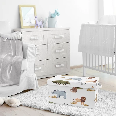 Jungle Collection Sweet Jojo Designs fabric toy bins are perfect for storing and organizing unruly clutter in any room or nursery. Each toy box features an attached flip lid to keep clutter out of sight, including dirty clothes to replace your clothing hampers and baskets. This kid friendly storage solution is collapsible to save space when not in use. Built-in reinforced handles for easy transport – Reinforced sturdy flip lid. Please note: actual print may vary on toybins featuring printed fabric. Sweet Jojo Designs creates various coordinating room accessories and decor for all of their children’s bedding and nursery bedding set collections (These items not included). Features a multicolor watercolor jungle animals print