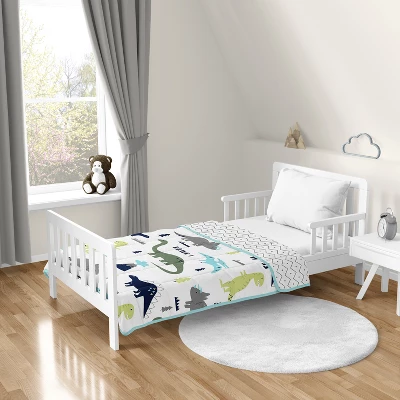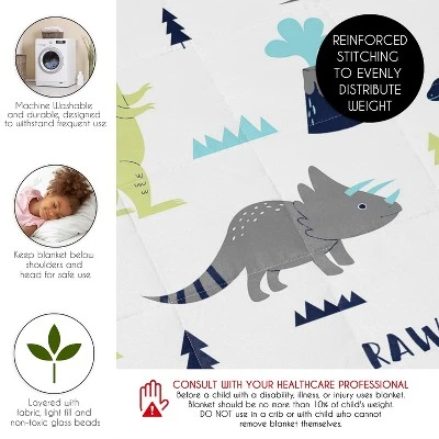 Mod Dinosaur Blue and Green Collection Sweet Jojo Designs helps improve and foster a comforting and safe sleep environment for your little one with our weighted blankets for kids. This weighted blanket cover was created to become your next bed time essential. Made with a brushed microfiber fabric and non-toxic glass beads, this kids weighted blanket 5 pounds has quilted grid squares to ensure an even distribution of weight across the body to reduce tossing and turning during the night and feel like a cozy hug! Lay the toddler weighted blanket to help induce a deep and restful slumber by stimulating important pressure points and relaxing the body to improve the physical development and mental development and concentration in the daily life of your growing child. Use this as a sensory weighted blanket for kids who live with anxiety and/or Autism to provide a sense of security while lowering anxiety levels, reducing sensory overloads and promoting a sense of peace and safety. This portable, small weighted blanket can be used all around the house or bring with you on-the-go. Being smaller than an ordinary blanket, this doubles as a weighted blanket for adults! Concentrate the weight on your body with a weighted lap blanket while you read, meditate, watch television, lay on the couch, or mindlessly scrolling on your phone. Stains and spills are apparent in everyday life when children are involved, so having a machine washable weighted blanket is important. Durability and quality allows you to throw this sensory blanket into the wash and tumble dry low for repeat use. Choose the perfect weighted blanket for your child and watch them drift off into sweet, peaceful dreams! Featuring a layered design of light fill and evenly distributed non-toxic glass beads and an outer layer of exclusively designed brushed microfiber fabric of a navy blue and dark green modern dino and prehistoric grey and white bohemian volcano mod dinosaurs print and reverses to a white and gray geometric chevron print and finished with solid turquoise trim.