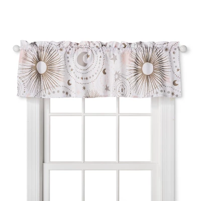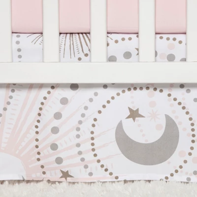 Pink and Gold Celestial 11pc Crib Bedding Set has all that your little bundle of joy will need. Let the little one in your home settle down to sleep in this incredible nursery set. This baby girl bedding set features a stars and moons celestial themed print, a coordinating metallic gold star print, and solid blush pink and gray fabric. This collection uses the stylish colors of blush pink, metallic gold, gray and white. The design uses brushed microfiber fabrics that are machine washable for easy care. This wonderful set will fit most standard cribs and toddler beds. Crib set includes: Crib Comforter, Fitted Sheet, Crib Skirt (Dust Ruffle), Diaper Stacker, Toy Bag, Decorative Pillow, Set of 3 Wall Hangings and 2 Window Valances.