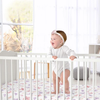 Butterfly Sweet Jojo Designs crib sheets are a stylish upgrade to your baby nursery or toddler bedroom and sure to be your favorite newborn essential. Using lightweight and durable material, this crib mattress sheet is made with soft fabrics and fully elastic bottom for a secure fit on most standard crib size and toddler beds. Don’t forget to buy extras! It’s always good to have multiple baby bedding sheets to use in between laundry wash days and easily change in case of emergencies. Pair your crib baby sheet with your favorite Sweet Jojo Designs crib bedding sets, receiving security blankets, changing pad covers and other baby room decor accessories (These items not included). This brushed microfiber crib sheet features an exclusive design of a blush pink, purple lavender and yellow shabby chic colorful pastel lilac watercolor butterfly pattern.