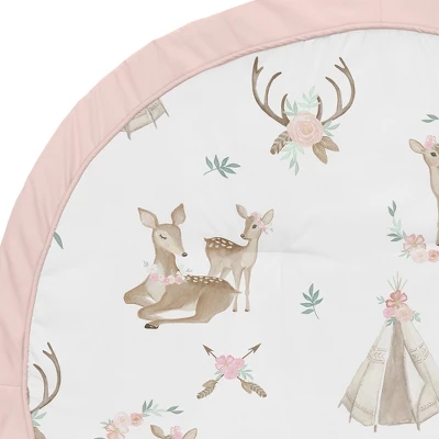 Deer Floral Collection Play Mats by Sweet Jojo Designs make tummy time and child development stylish and fun. Made with soft fabrics and fluffy fill, this multi-functional mat is small enough to take on the go. These adorable playmats will transform any room into the perfect play space. Great for vacations, playdates, beach outings, and everyday use at home. Always be aware of baby’s surroundings and keep an eye on baby while in use. Not intended for sleep. Sweet Jojo Designs creates various coordinating room accessories and decor for all of their children’s bedding and nursery bedding set collections (These items not included). Playmat is designed using a blush pink and mint green watercolor deer floral print and finished with blush pink piping and border – Brushed Microfiber