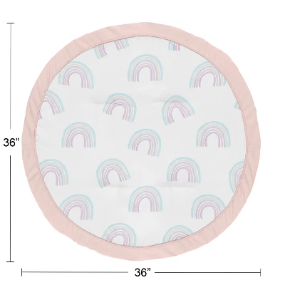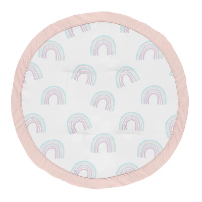 Rainbow Collection Play Mats by Sweet Jojo Designs make tummy time and child development stylish and fun. Made with soft fabrics and fluffy fill, this multi-functional mat is small enough to take on the go. These adorable playmats will transform any room into the perfect play space. Great for vacations, playdates, beach outings, and everyday use at home. Always be aware of baby’s surroundings and keep an eye on baby while in use. Not intended for sleep. Sweet Jojo Designs creates various coordinating room accessories and decor for all of their children’s bedding and nursery bedding set collections (These items not included). Playmat is designed using a multicolor watercolor rainbow print and finished with blush pink piping and border – Brushed Microfiber