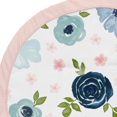 Watercolor Floral Navy and Pink Collection Play Mats by Sweet Jojo Designs make tummy time and child development stylish and fun. Made with soft fabrics and fluffy fill, this multi-functional mat is small enough to take on the go. These adorable playmats will transform any room into the perfect play space. Great for vacations, playdates, beach outings, and everyday use at home. Always be aware of baby’s surroundings and keep an eye on baby while in use. Not intended for sleep. Sweet Jojo Designs creates various coordinating room accessories and decor for all of their children’s bedding and nursery bedding set collections ( These items not included ). Playmat is designed using a navy blue and pink watercolor floral print and finished with blush pink piping and border – Brushed Microfiber