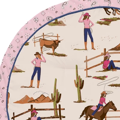 Western Cowgirl Collection Play Mats by Sweet Jojo Designs make tummy time and child development stylish and fun. Made with soft fabrics and fluffy fill, this multi-functional mat is small enough to take on the go. These adorable playmats will transform any room into the perfect play space. Great for vacations, playdates, beach outings, and everyday use at home. Always be aware of baby’s surroundings and keep an eye on baby while in use. Not intended for sleep. Sweet Jojo Designs creates various coordinating room accessories and decor for all of their children’s bedding and nursery bedding set collections (These items not included). Playmat is designed using a light pink, brown, beige, blue, cream, taupe, tan and off white wild west vintage country retro animal horse southwest western cowgirl print and finished with blush pink bandana print piping and border – Brushed Microfiber