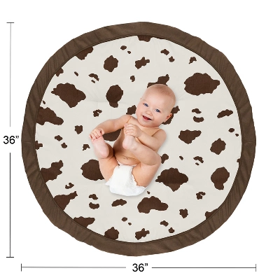 Western Cowgirl Collection Play Mats by Sweet Jojo Designs make tummy time and child development stylish and fun. Made with soft fabrics and fluffy fill, this multi-functional mat is small enough to take on the go. These adorable playmats will transform any room into the perfect play space. Great for vacations, playdates, beach outings, and everyday use at home. Always be aware of baby’s surroundings and keep an eye on baby while in use. Not intended for sleep. Sweet Jojo Designs creates various coordinating room accessories and decor for all of their children’s bedding and nursery bedding set collections (These items not included). Playmat is designed using a chocolate brown, beige, cream and off white vintage country animal cow print and finished with solid chocolate brown piping and border – Brushed Microfiber