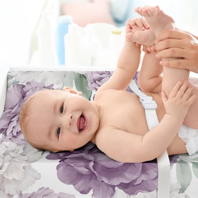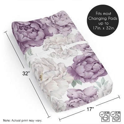 Peony Floral Garden Lavender Purple and Ivory Collection Sweet Jojo Designs baby changing pad sheet covers is the perfect nursery essential. Use a changing mat cover sheet for extra protection and comfort for newborns and toddlers during outfit changes or changing diapers. And it’s always a good idea to buy extras so you can easily change it out when it’s time to wash. Sweet Jojo Designs offers coordinating crib bedding sets, receiving security blankets, nursing pillow covers and other baby room decor accessories (These items not included). This brushed microfiber diaper pad cover sheet features an exclusive design of a lavender purple, light lilac violet, sage green, off white, ivory and cream boho shabby chic bohemian vintage garden watercolor flower nature elegant colorful pastel floral print.