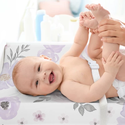 Watercolor Floral Lavender and Grey Collection Sweet Jojo Designs baby changing pad sheet covers is the perfect nursery essential. Use a changing mat cover sheet for extra protection and comfort for newborns and toddlers during outfit changes or changing diapers. And it’s always a good idea to buy extras so you can easily change it out when it’s time to wash. Sweet Jojo Designs offers coordinating crib bedding sets, receiving security blankets, nursing pillow covers and other baby room decor accessories (These items not included). This brushed microfiber diaper pad cover sheet features an exclusive design of lavender purple pink grey bohemian shabby chic farmhouse boho floral watercolor violet gray and white rose lily elegant flowers print for the Watercolor Floral Lavender and Grey Collection.