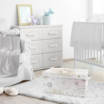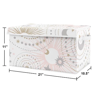 Celestial Pink and Gold Collection Sweet Jojo Designs fabric toy bins are perfect for storing and organizing unruly clutter in any room or nursery. Each toy box features an attached flip lid to keep clutter out of sight, including dirty clothes to replace your clothing hampers and baskets. This kid friendly storage solution is collapsible to save space when not in use. Built-in reinforced handles for easy transport – Reinforced sturdy flip lid. Please note: actual print may vary on toybins featuring printed fabric. Sweet Jojo Designs creates various coordinating room accessories and decor for all of their children’s bedding and nursery bedding set collections (These items not included). Features a pink, gold, and grey star and moon celestial print