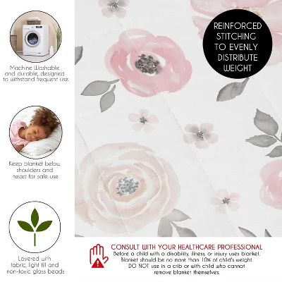 Watercolor Floral Pink and Grey Collection Sweet Jojo Designs helps improve and foster a comforting and safe sleep environment for your little one with our weighted blankets for kids. This weighted blanket cover was created to become your next bed time essential. Made with a brushed microfiber fabric and non-toxic glass beads, this kids weighted blanket 5 pounds has quilted grid squares to ensure an even distribution of weight across the body to reduce tossing and turning during the night and feel like a cozy hug! Lay the toddler weighted blanket to help induce a deep and restful slumber by stimulating important pressure points and relaxing the body to improve the physical development and mental development and concentration in the daily life of your growing child. Use this as a sensory weighted blanket for kids who live with anxiety and/or Autism to provide a sense of security while lowering anxiety levels, reducing sensory overloads and promoting a sense of peace and safety. This portable, small weighted blanket can be used all around the house or bring with you on-the-go. Being smaller than an ordinary blanket, this doubles as a weighted blanket for adults! Concentrate the weight on your body with a weighted lap blanket while you read, meditate, watch television, lay on the couch, or mindlessly scrolling on your phone. Stains and spills are apparent in everyday life when children are involved, so having a machine washable weighted blanket is important. Durability and quality allows you to throw this sensory blanket into the wash and tumble dry low for repeat use. Choose the perfect weighted blanket for your child and watch them drift off into sweet, peaceful dreams! Featuring a layered design of light fill and evenly distributed non-toxic glass beads and an outer layer of exclusively designed brushed microfiber fabric of a blush pink, grey and white boho floral bohemian farmhouse shabby chic gray rose lily watercolor elegant flowers print and reverses to a white and gray mini polka dot print and finished with solid pink trim.