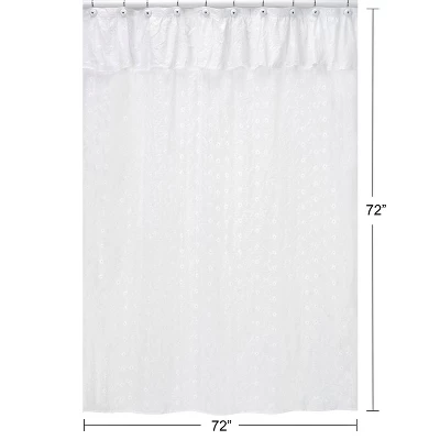 Eyelet White Collection Create an easy bathroom makeover with this Sweet Jojo Designs shower curtain. Add a touch of style and a splash of color to your bathroom to complete the look of your dream decorative theme. Sweet Jojo Designs creates various coordinating room accessories and decor for all of their children’s bedding and nursery bedding set collections (These items not included). Made with 12 reinforced button holes to prevent tearing. Fabrics include embroidered floral white eyelet and matching white eyelet ruffles