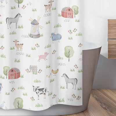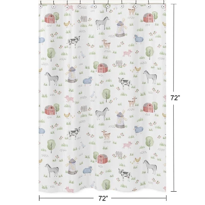 Farm Animals Collection Create an easy bathroom makeover with this Sweet Jojo Designs shower curtain. Add a touch of style and a splash of color to your bathroom to complete the look of your dream decorative theme. Sweet Jojo Designs creates various coordinating room accessories and decor for all of their children’s bedding and nursery bedding set collections (These items not included). Made with 12 reinforced button holes to prevent tearing. Features grey, red, green, gray, black and white nature trees farmhouse barn cow, horse, sheep, pig, goat and chickens watercolor farm animals